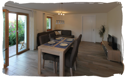 Das Apartment befindet sich im Erdgeschoss und bietet direkten Zugang zum privaten Garten und zur Liegewiese – ideal zum Entspannen und Sonne tanken.